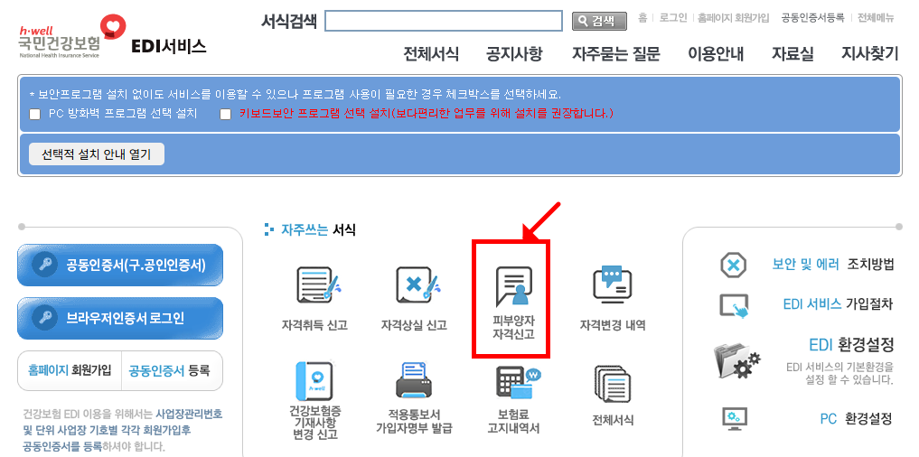 건강보험 EDI에서는 직장가입자의 피부양자 등록·변경·상실 신고도 처리할 수 있습니다.