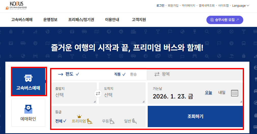 - 홈페이지 접속 후, 출발지·도착지 선택 (https://www.kobus.co.kr)