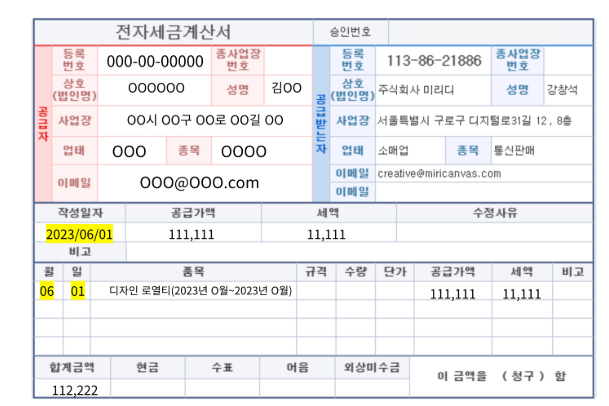 작성일자(=발행일자)는 공급시기를 기준으로 하며, 실제 거래일과 다르게 적으면 과태료 또는 허위 세금계산서로 처리될 수 있습니다.